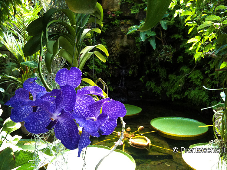 La Mortella ospita migliaia di piante mediterranee e tropicali. Tra queste spicca la collezione di piante acquatiche, in cui regna indiscussa la Victoria amazonica. Questa pianta, originaria del Rio delle Amazzoni, cresce in una vasca del giardino a valle, dominata da una scultura di Simon Verity che raffigura un’enorme bocca. Le sue foglie possono raggiungere due metri di diametro e i gambi otto metri di altezza. I suoi fiori ermafroditi cambiano sesso e colore in un solo giorno: nascono femminili e bianchi, per poi trasformarsi in maschili e rossi. I fiori femmina si aprono al calar del sole e rimangono aperti fino al mattino, mentre quelli maschili sbocciano nel primo pomeriggio.